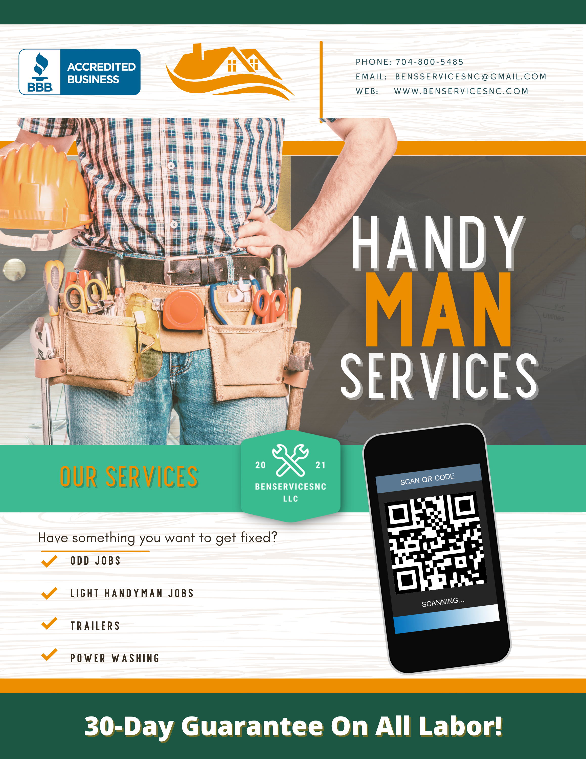 Ben’s Services is a reliable handyman business that needed effective marketing materials to reach more customers. I created several eye-catching flyers to promote their services, along with a mockup of the website homepage to enhance their online presence and attract new clients.